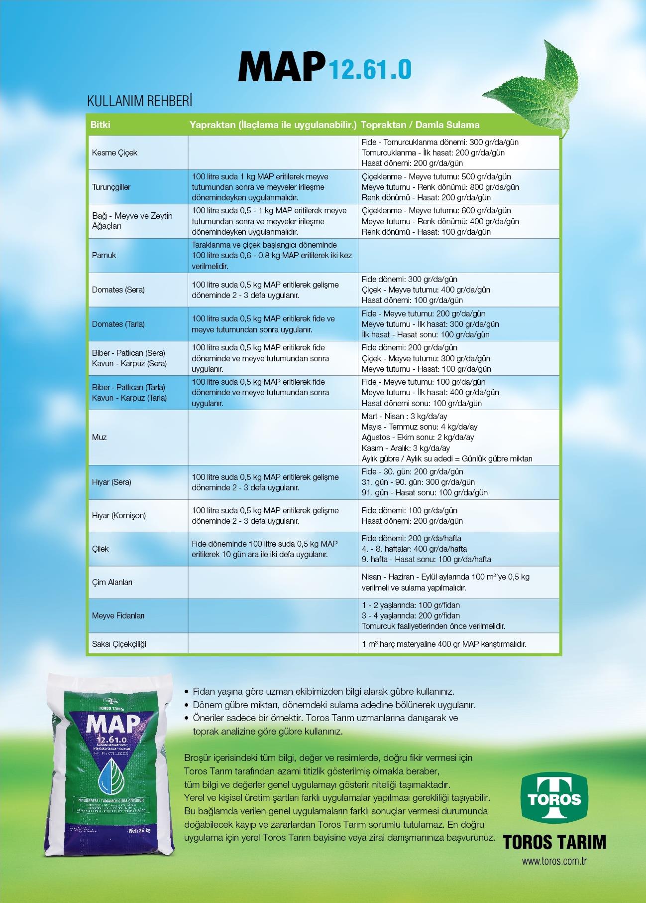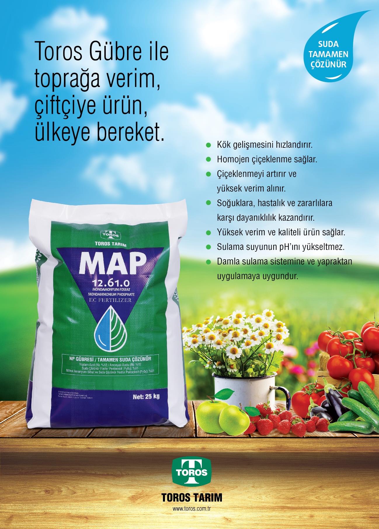 MAP (12-61-0) suda tamamen eriyen bir gübredir. Formülü NH4H2PO4 - %12 N (azot) + %61 P2O5 (fosfor) şeklindedir. Fosfat kaynağı gübreler arasında en yüksek oranda fosfat içeren gübre türüdür. İçeriğindeki düşük azot miktarı sayesinde, bitkilere istenen oranda fosfor sağlamanın en uygun yoludur. Klor, sodyum ve ağır metaller gibi, bitkilere zarar verebilecek herhangi bir madde içermediğinden, tüm ürünlerde güvenli bir şekilde kullanılabilir. MAP gübresindeki azotun tamamı amonyak azotu olduğundan, bu elementin bitkilere kontrollü olarak ulaşması sağlanır.